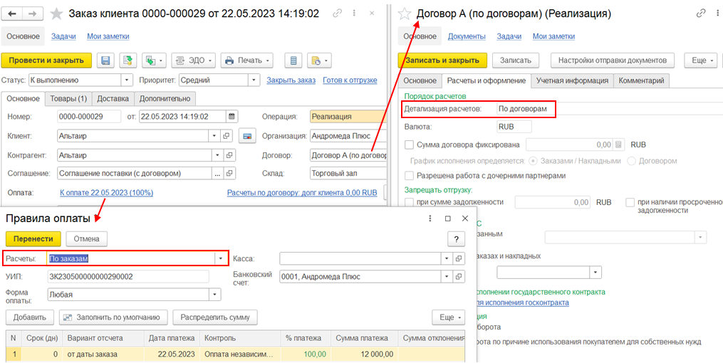 Порядок расчетов в договоре с клиентом с целью Реализация через комиссионера определяется договором с комиссионером и недоступен для изменения.