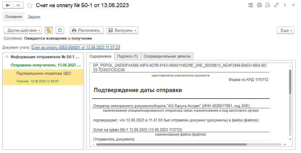 Если в настройках отправки электронного документа установлен флаг Ожидать извещение о получении, то далее документ переходит в статус Ожидает извещение о получении. Если флаг не установлен, Ожидается подтверждение. В рабочем месте Главное – см. также - Текущие дела ЭДО документ будет по-прежнему отображаться в папке Исходящие\На контроле.