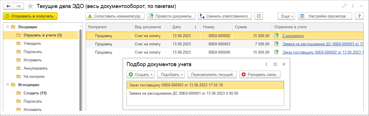 Если в настройках получения будет стоять способ обработки Вручную в форме электронного документа, то при получении электронного счета на оплату в папке Отразить в учете в графе Отражение в учете будет стоять гиперссылка со значением Создать документы, при переходе по которой откроется форма Подбор документов учета для создания соответствующих документов в учетной системе или выбора уже существующих документов. По одному счету можно создать несколько прикладных документов, например, Заказ поставщику и Заявку на расходование ДС.
