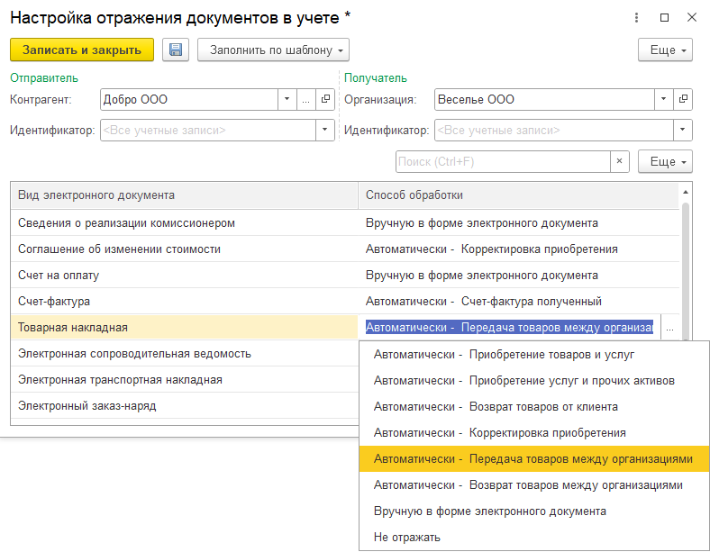 Также необходимо выполнить настройки в разделе Администрирование - Обмен электронными документами - Обмен с контрагентами - Настройки ЭДО на закладке Настройки получения: для документа Товарная накладная задать способ обработки Автоматически – Передача товаров между организациями.