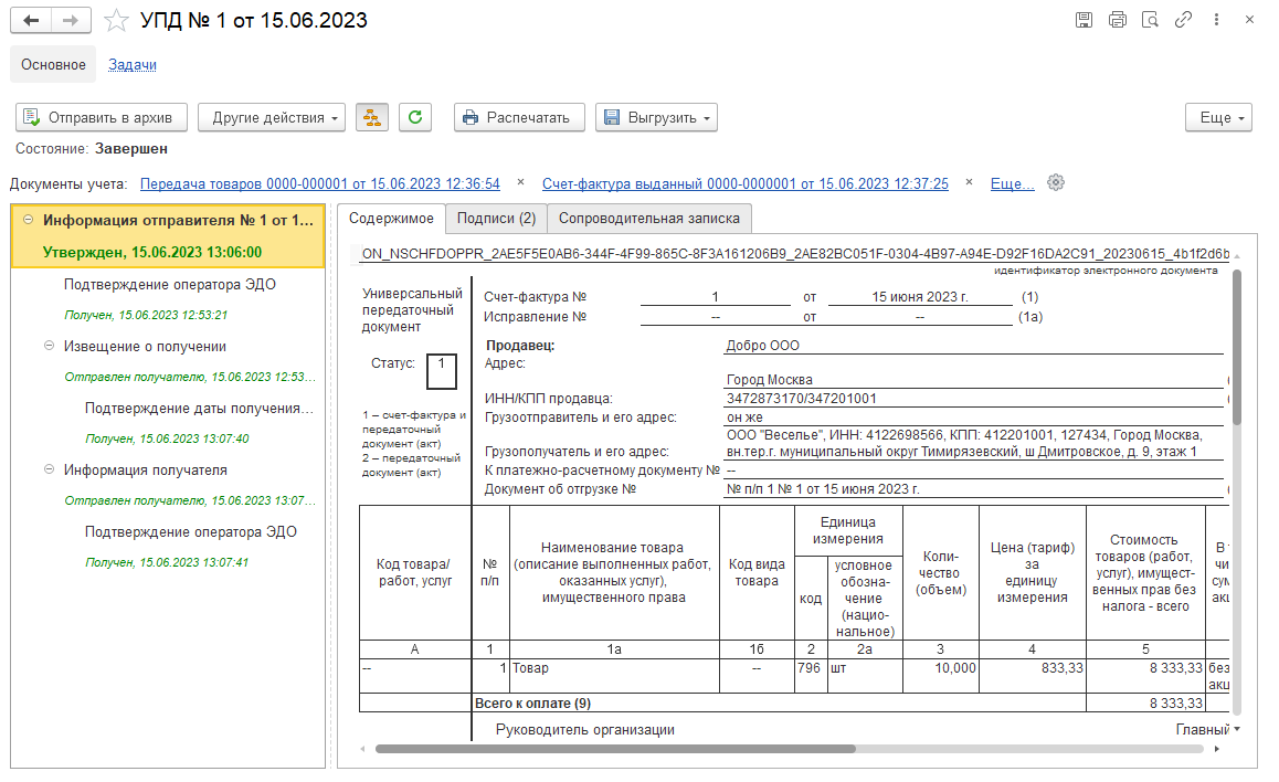 При указанных выше настройках получения документов входящий электронный документ будет автоматически привязан к учетным документам Передача товаров и Счет-фактура, которые будет определены по уникальному идентификатору, присвоенному при формировании электронного документа на стороне отправителя. В графе Отражение в учете сразу появится гиперссылка на эти документы учета (2 документа).