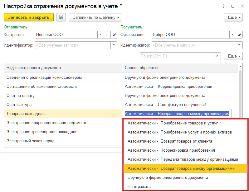 Для организации-продавца необходимо выполнить настройки на закладке Настройки получения: для документа Товарная накладная задать способ обработки Автоматически – Возврат товаров между организациями.