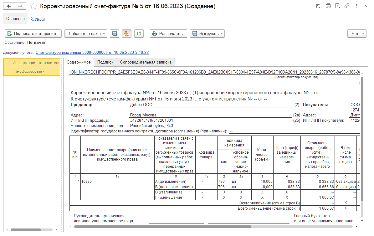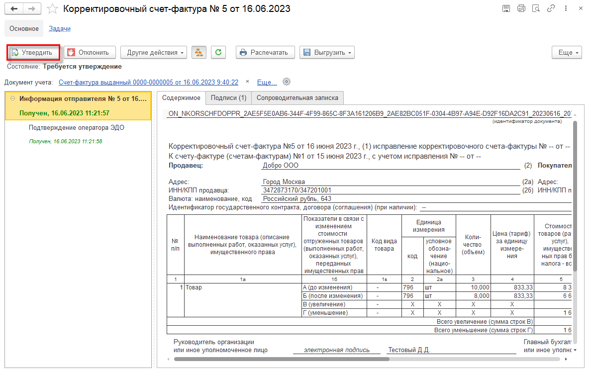 После утверждения корректировочного счета-фактуры электронный документооборот на стороне организации–покупателя считается завершенным.
