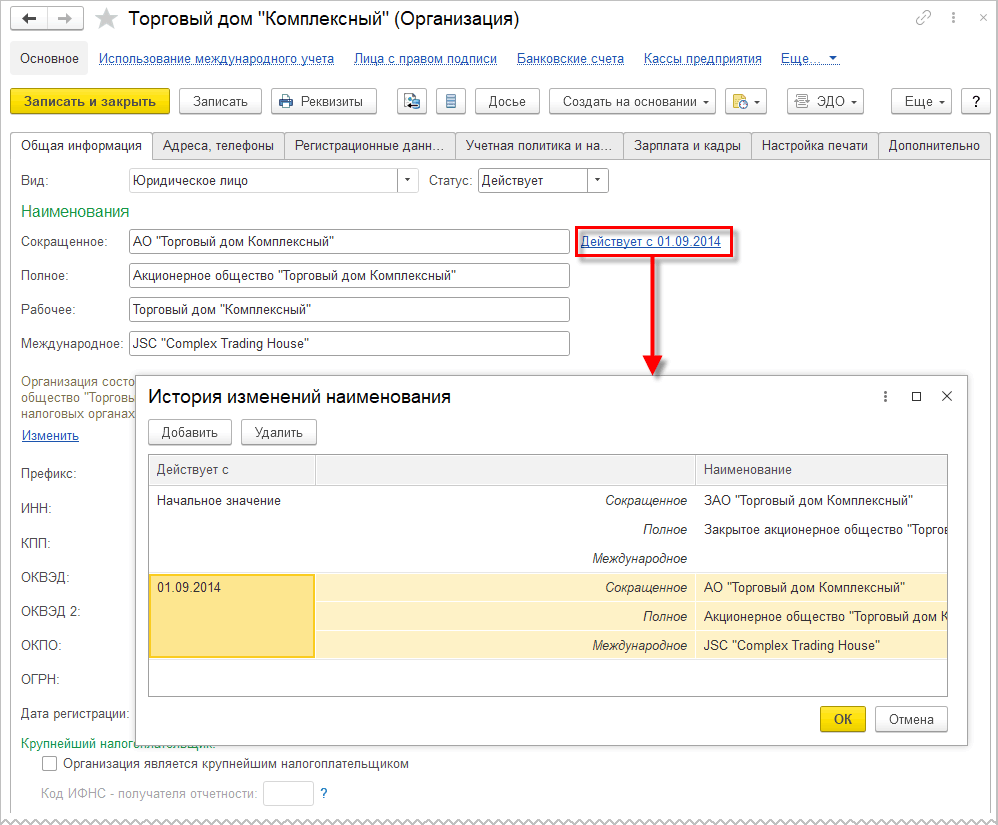 Для просмотра и редактирования значений реквизитов Полное наименование, Сокращенное наименование, Международное наименование на определенную дату используется отдельная форма, которая открывается по ссылке справа от реквизита Сокращенное: в форме карточки организации на закладке Общая информация.