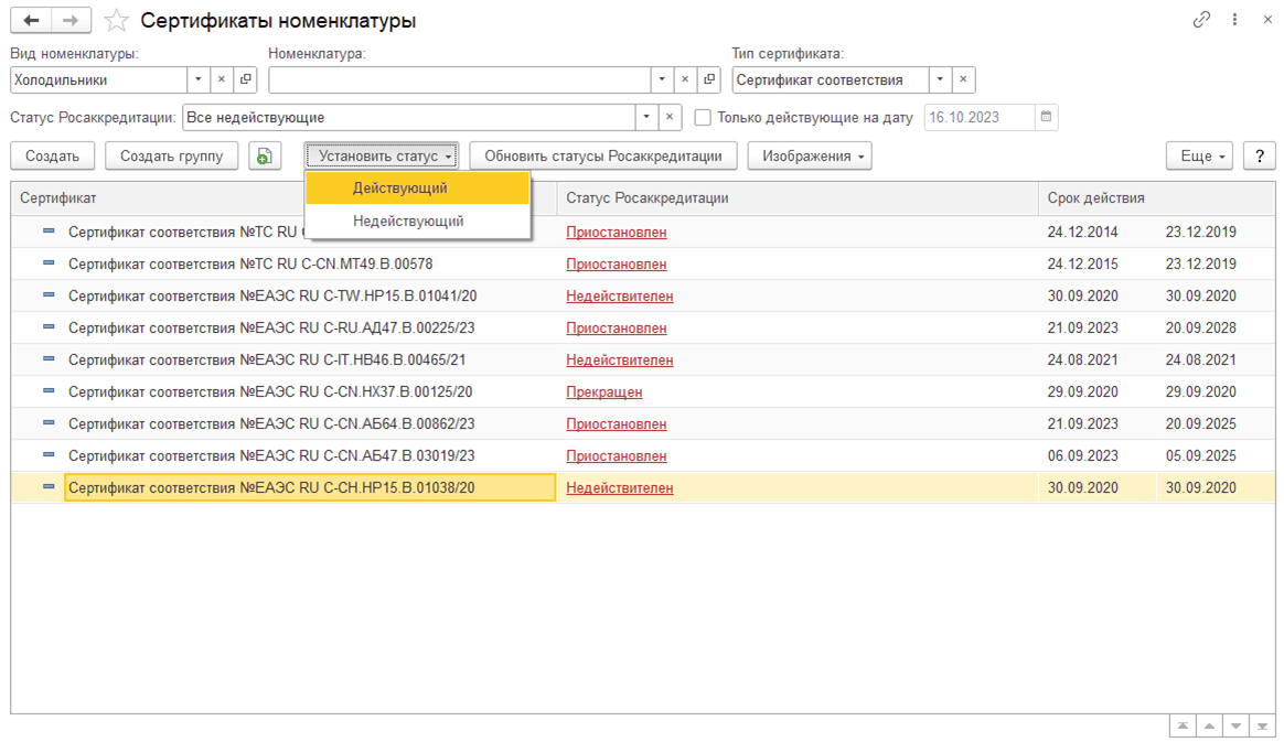 Для интерактивной актуализации сведений справочника сертификатов номенклатуры в форме списка сертификатов предусмотрена команда Обновить статусы Росаккредитации. По команде в информационную базу загружается информация об актуальном Статусе, ссылка на сайт страницы ФСА с карточкой сертификата или декларации и устанавливается дата обновления сведений. Если установлен вариант Проверять и обновлять статус действия, то дополнительно обновляется Статус действия сертификата информационной базы в соответствии со статусом реестра сервиса ФСА.