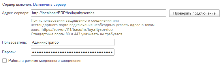После публикации можно переходить к настройкам сервера лояльности в информационной базе. В частности, необходимо выполнить следующие действия: