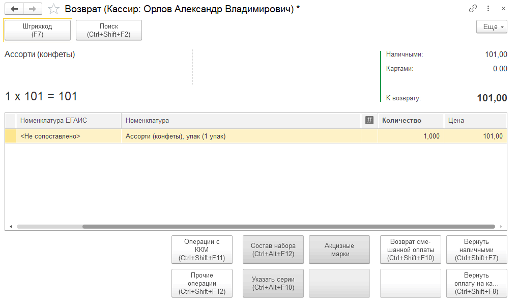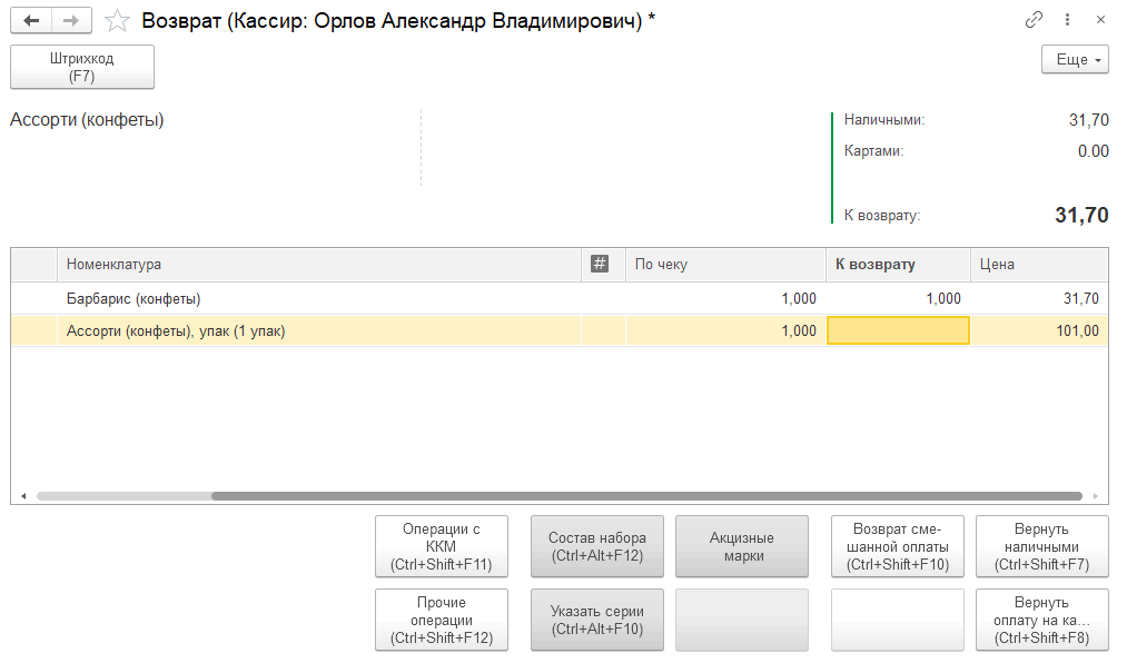 Отсутствующую в чеке, но доступную к возврату позицию можно добавить в чек возврата по штрихкоду. Однако добавлять в чек позицию, которой не было в чеке продажи или устанавливать количество к возврату больше, чем было продано по чеку, запрещено. В этом случае количество к возврату не изменяется и выдается сообщение в нижней части формы.