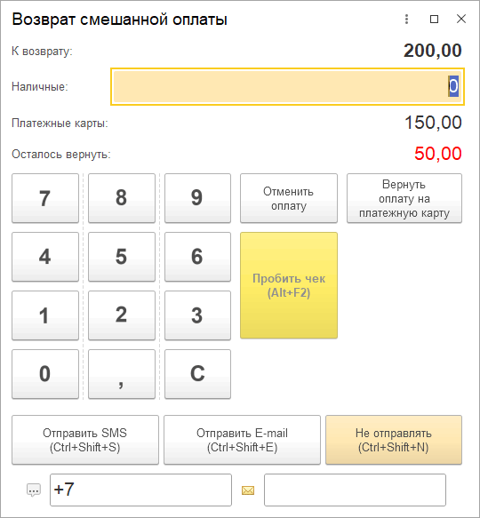 После получения ответа о завершении операции от эквайрингового терминала, открывается форма смешанной оплаты. Если сумма возврата меньше суммы чека, тогда открывается форма смешанной оплаты в «полном» режиме. Предполагается, что пользователь хочет вернуть оставшуюся сумму другими видами оплаты.