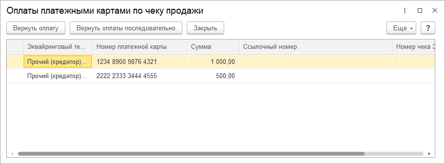 Информацию о неотмененных оплатах по чеку продажи можно посмотреть на форме Оплата платежными картами по чеку продажи, которая открывается из меню Еще на форме РМК (возврат). Форма содержит справочную информацию только о неотмененных оплатах платежными картами по чеку продажи. Такая информация может быть использована в редких случаях, когда банк требует, чтобы были обязательно указаны дополнительные данные возвращаемой оплаты (например, ссылочный номер). Также работа с данной формой может потребоваться, если исходная покупка была частично оплачена с двух и более карт. В этом случае по каждой оплате отображается отдельная строка.