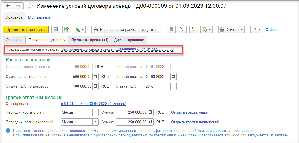 В полях Сумма услуг по аренде и Сумма НДС по аренде автоматически выводятся данные по будущим платежам и начислениям на основании графиков оплат и начислений, начиная с даты документа Изменение условий договора аренды. В поле Обеспечительный платеж выводятся данные о не зачтенном остатке по обеспечительному платежу.