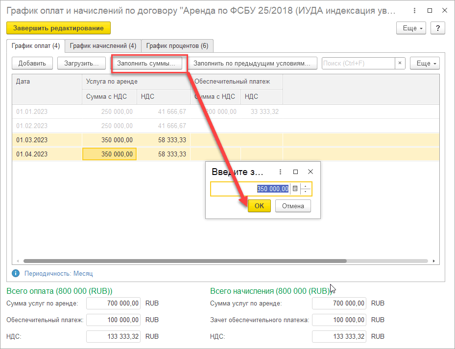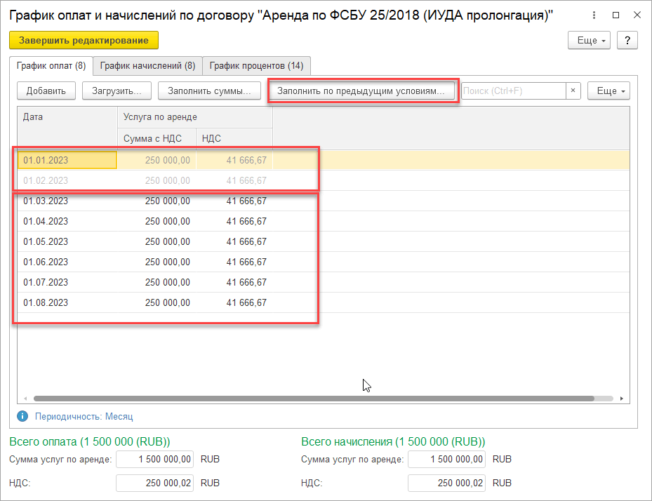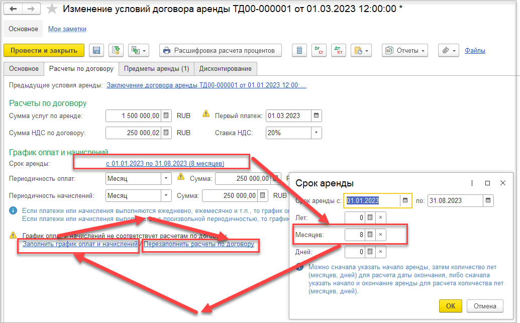 После ввода новых значений необходимо нажать на гиперссылки: Заполнить график оплат и начислений, и затем Перезаполнить расчеты по договору.