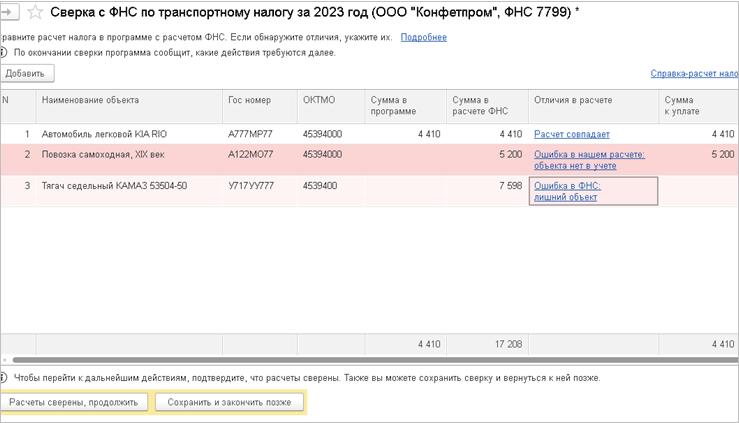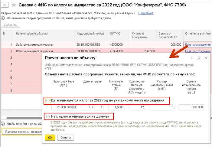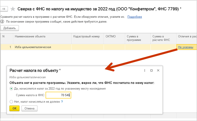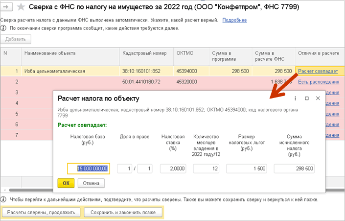 Если сверка расчета налога с данными ФНС выполнена автоматически, при наличии расхождений в строке также можно открыть карточку расчета налога по объекту и выбрать вариант указания отличий.
