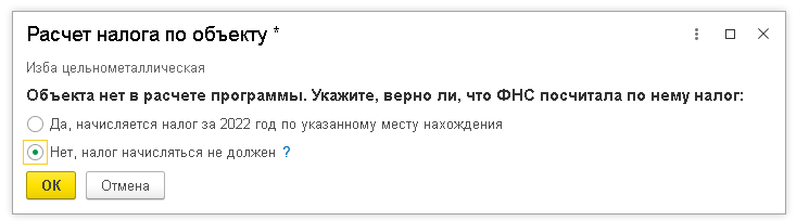 В карточке расчета налога по объекту выбирается вариант Объект есть в расчете ФНС, но сумма неверная, и по кнопке Далее открывается форма редактирования данных.