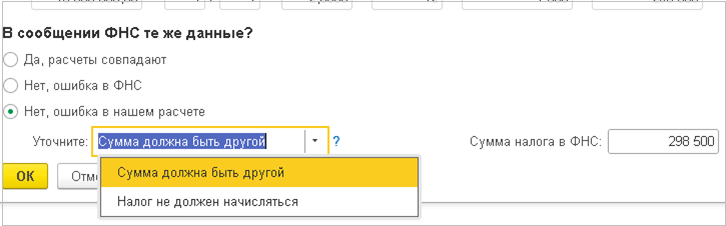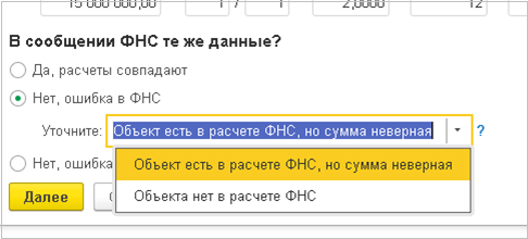 Рассмотрим пример указания отличий в расчетах в случае, когда объект есть в расчете ФНС, но сумма неверная.