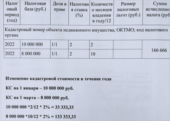 В справке по расчету налога, полученной от ФНС, указывается общая сумма налога по объекту с изменявшимися параметрами.