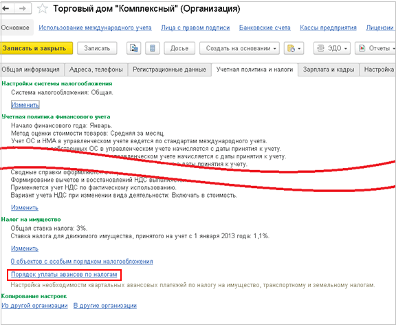 Порядок уплаты авансов настраивается из карточки организации, на закладке Учетная политика и налоги. По гиперссылке открывается форма настройки уплаты авансов.