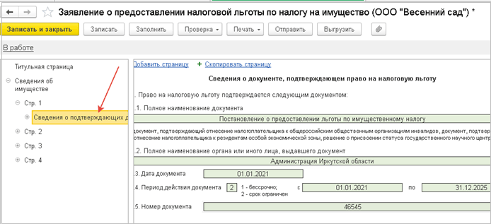 Информация из справочника попадает в Заявление о предоставлении налоговой льготы на страницу сведений о подтверждающих документах.