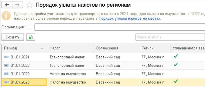 Переносятся записи по настройке уплаты авансов по транспортному налогу с 01.01.2021 г. и налогу на имущество с 01.01.2022 г.
