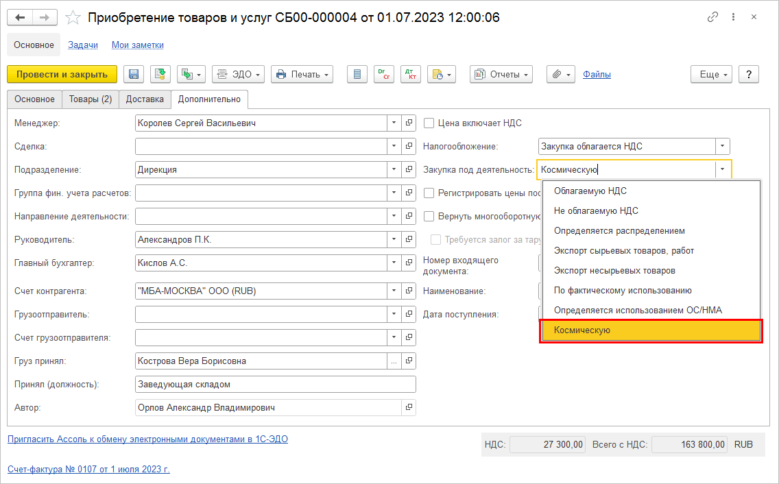 Если в учетной политике организации включена настройка Учет НДС в космической деятельности, тогда в документах приобретения (перемещения, списаний и пр.) товаров (работ, услуг) становится доступен новый вид деятельности НДС Космическую.