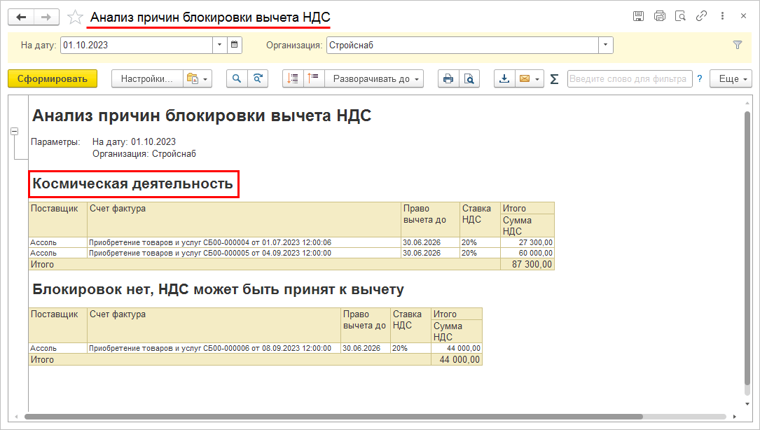 Для анализа и контроля заблокированного к вычету НДС, отнесенного под вид деятельности Космическую, в отчет Анализ причин блокировки вычета НДС добавлена новая причина Космическая деятельность.