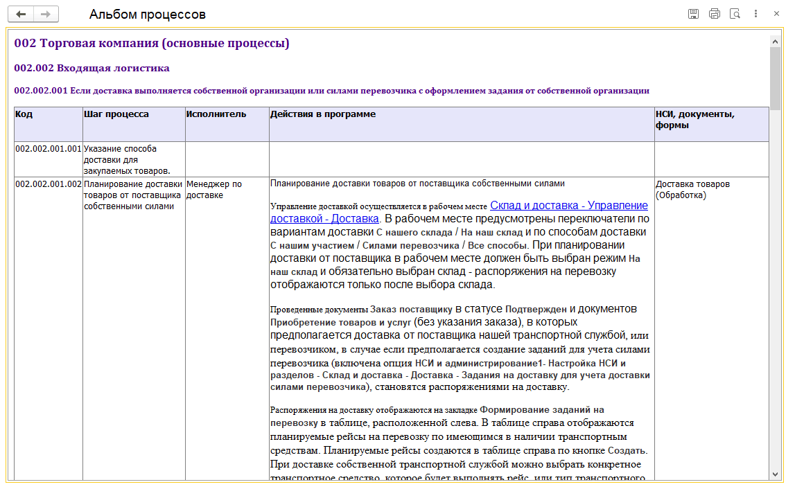 В описаниях процессов в демобазе приводятся ссылки на реальные объекты демобазы. По ссылке можно открыть этот объект и не только посмотреть его внешний вид при текущих настройках информационной базы, но и интерактивно поработать с этим объектом.