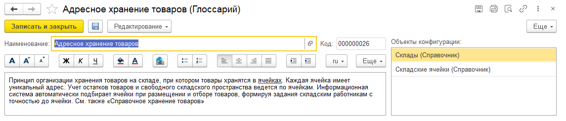 Редактирование определения производится непосредственно в форме элемента (без использования внешнего редактора). Предполагается, что в определениях глоссария используется менее разнообразное форматирование, а сами они уже все загружены и новые добавляются крайне редко. Для загрузки определений глоссария из внешнего файла в форме списка предусмотрена команда Загрузить.
