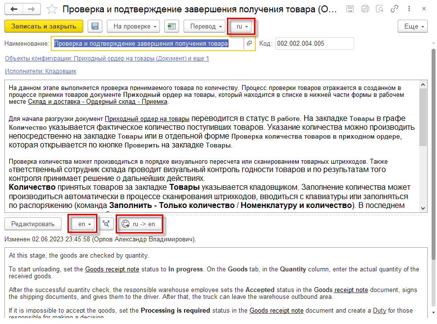 Команды переключения в режим редактирования и перевода описаний процессов размещены на панели инструментов в форме списка и в формах группы или элемента справочника Описание процессов. При включении режима редактирования в форме списка доступны команды создания и копирования групп и элементов, а также команды изменения порядка групп и элементов. При создании элемента или группы они открываются в режиме редактирования. При установленном режиме редактирования в списке существующие группы и элементы также открываются в режиме редактирования.