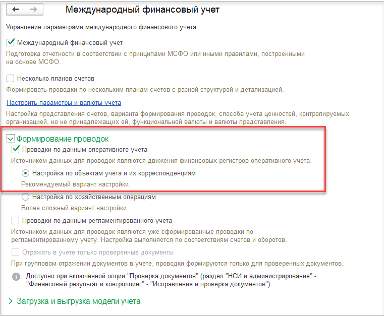 Если ведется международный финансовый учет, то рекомендуется переходить на новый алгоритм, если источником данных для проводок является Настройка по объектам учета и их корреспонденциям (раздел НСИ и администрирование – Настройка НСИ и разделов – Международный финансовый учет – Формирование проводок). Если источником данных для проводок является Настройка по хозяйственным операциям, то рекомендуем перейти на функциональную опцию Настройка по объектам учета и их корреспонденциям.