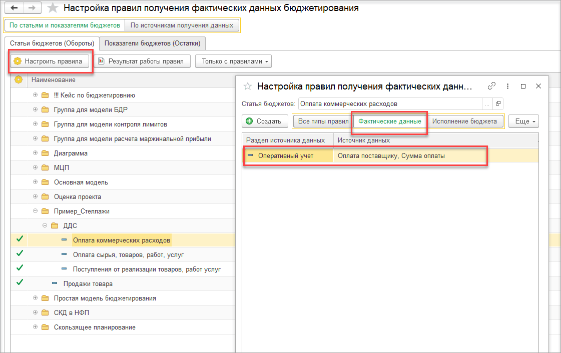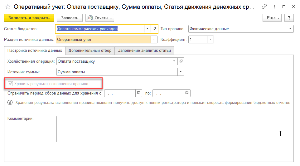 Также перед изменением настройки по получению фактических данных по статьям бюджета необходимо включить хранение факта по всем правилам по данным оперативного учета.