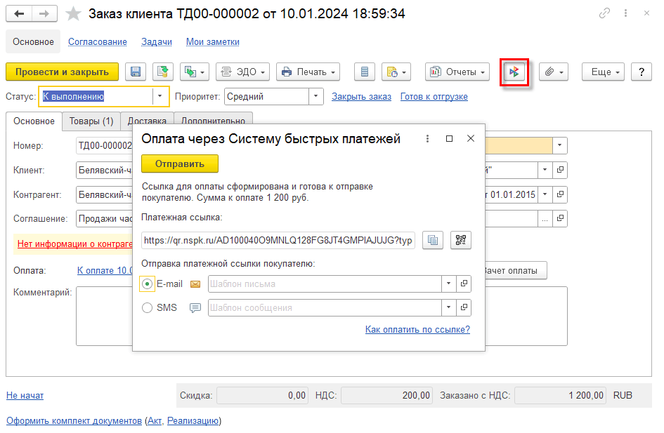 Инициировать оплату по СБП можно непосредственно из формы указанных документов. При этом формируется платежная ссылка, которую можно вывести на экран, направить покупателю по sms / email непосредственно из информационной базы или скопировать в буфер обмена и направить покупателю во внешних приложениях.