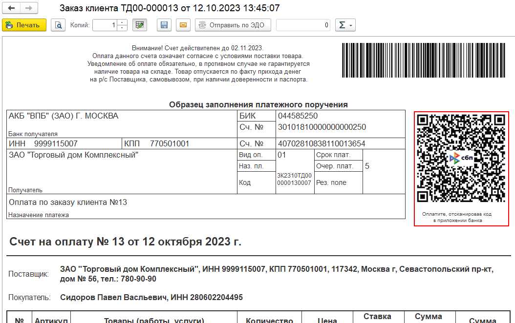 Если была сформирована платежная ссылка, QR-код оплаты по СБП выводится в форму счета на оплату.