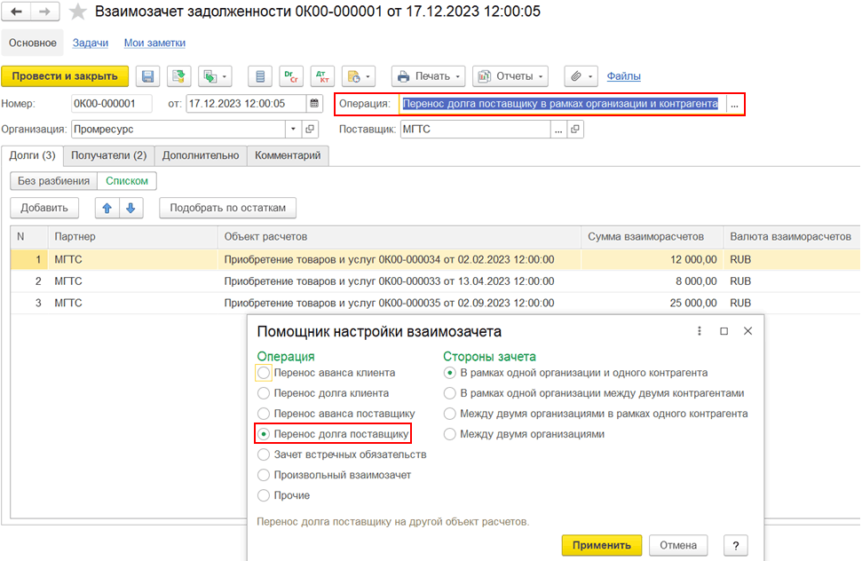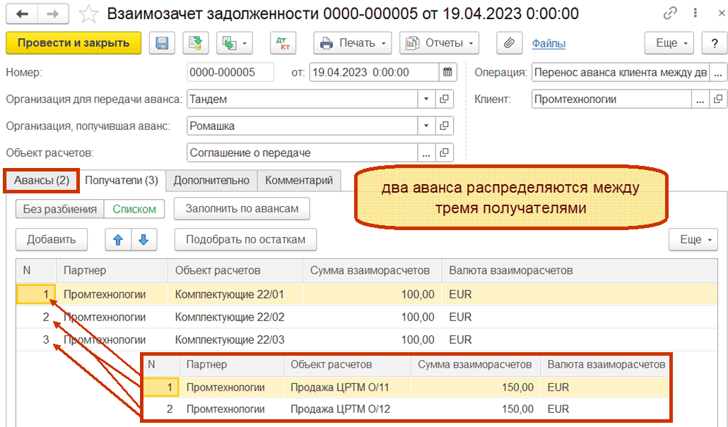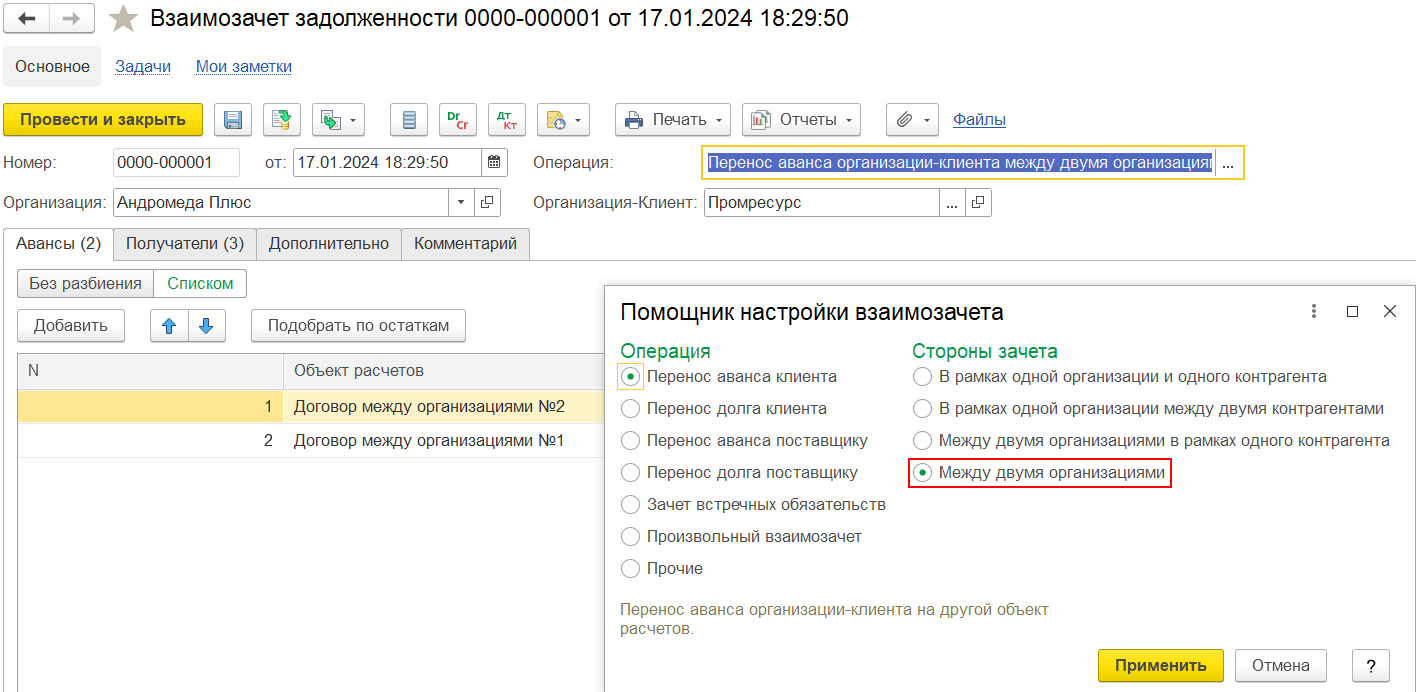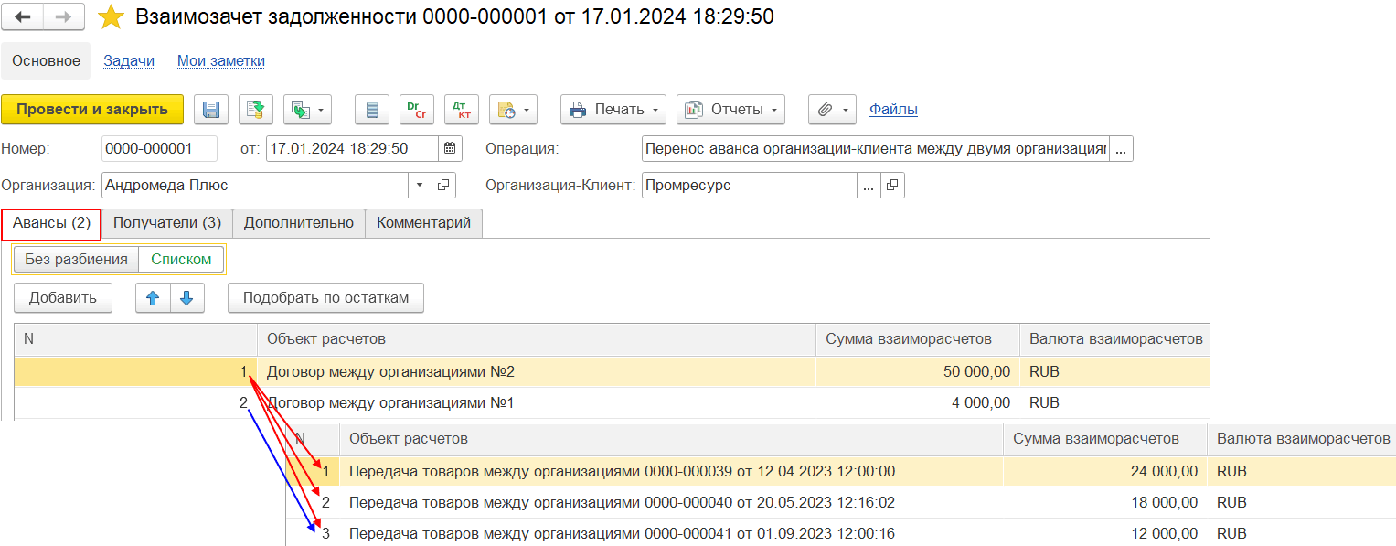 Отражаем перенос авансов с объектов расчетов, договоров между организациями, на объекты расчетов, документы «Передача товаров между организациями», документом Взаимозачет задолженности с операцией Перенос аванса организации-клиента между двумя организациями.