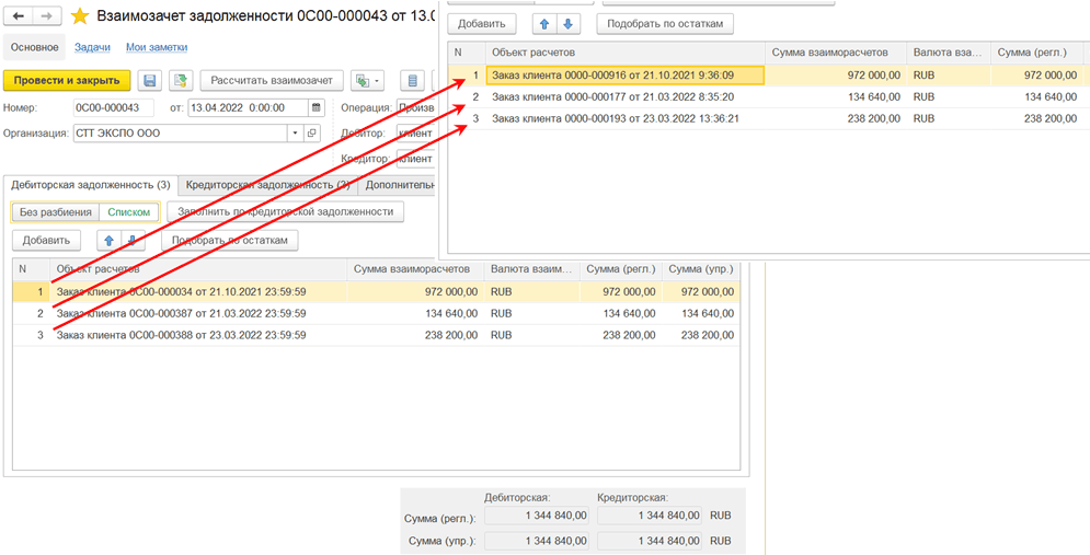 ■ Необходимо выполнить взаимозачет задолженности между двумя организациями без контрагента – погасить задолженность по объектам расчетов, документам «Передача товаров между организациями», распределив на них авансы с объектов расчетов, договоров между организациями.