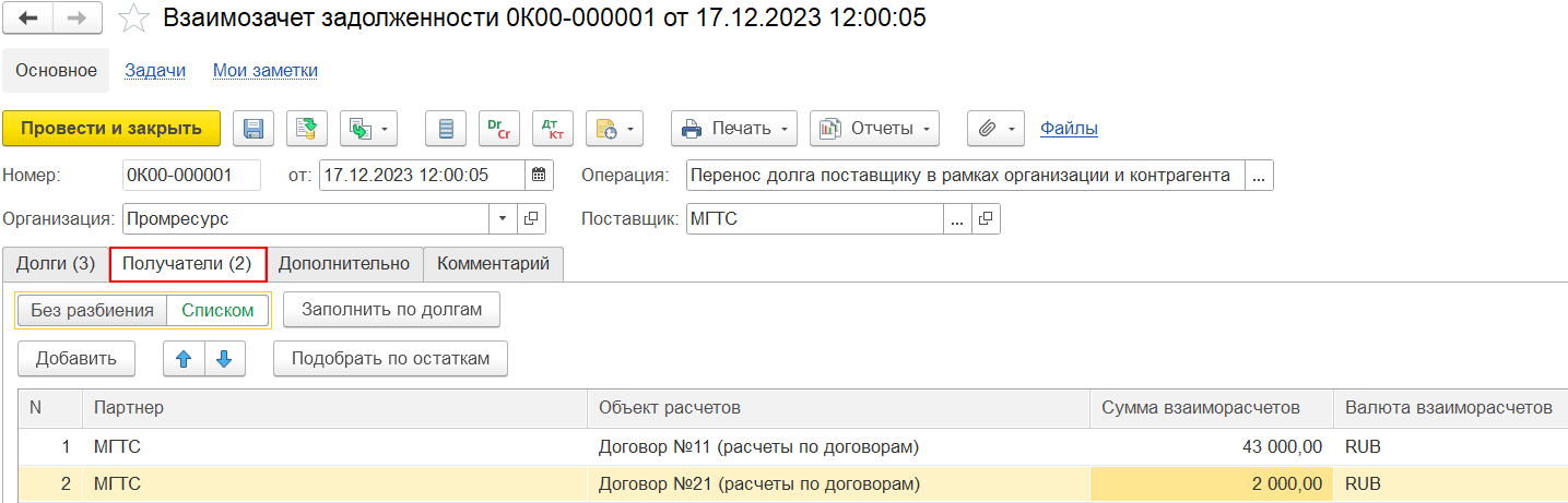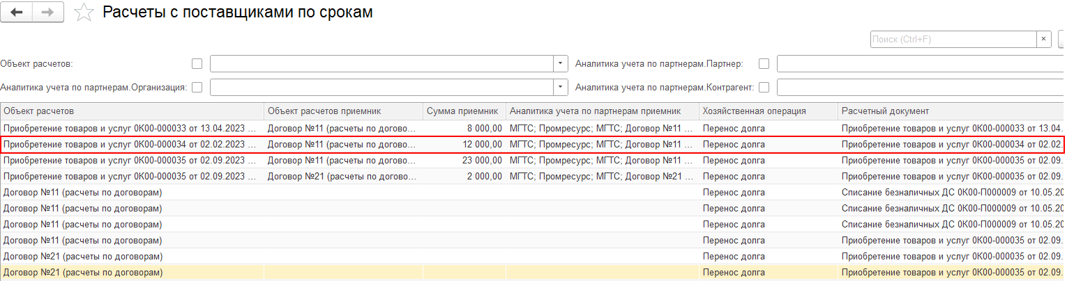 Например, в движениях оперативных регистров расчетов взаимозачета задолженности источник задолженности «Договор между организациями №2» распределяется на получателя (приемник) задолженности – объект расчетов, документ «Передача товаров между организациями» от 12.04.2023. Для источника задолженности «Договор между организациями №2» заполняются реквизиты «Объект расчетов приемник», «Аналитика учета по партнерам приемник», «Сумма приемник», «Валюта приемник».