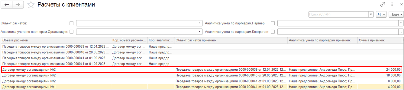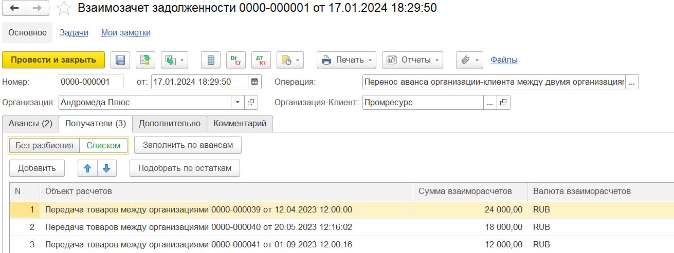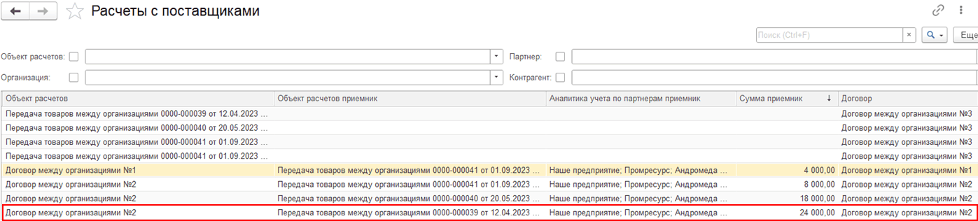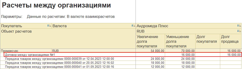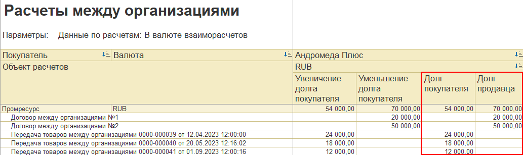 ■ По объектам расчетов, документам «Передача товаров между организациями», числится задолженность покупателя. У покупателя, организации «Промресурс», есть задолженность перед продавцом, организацией «Андромеда Плюс».