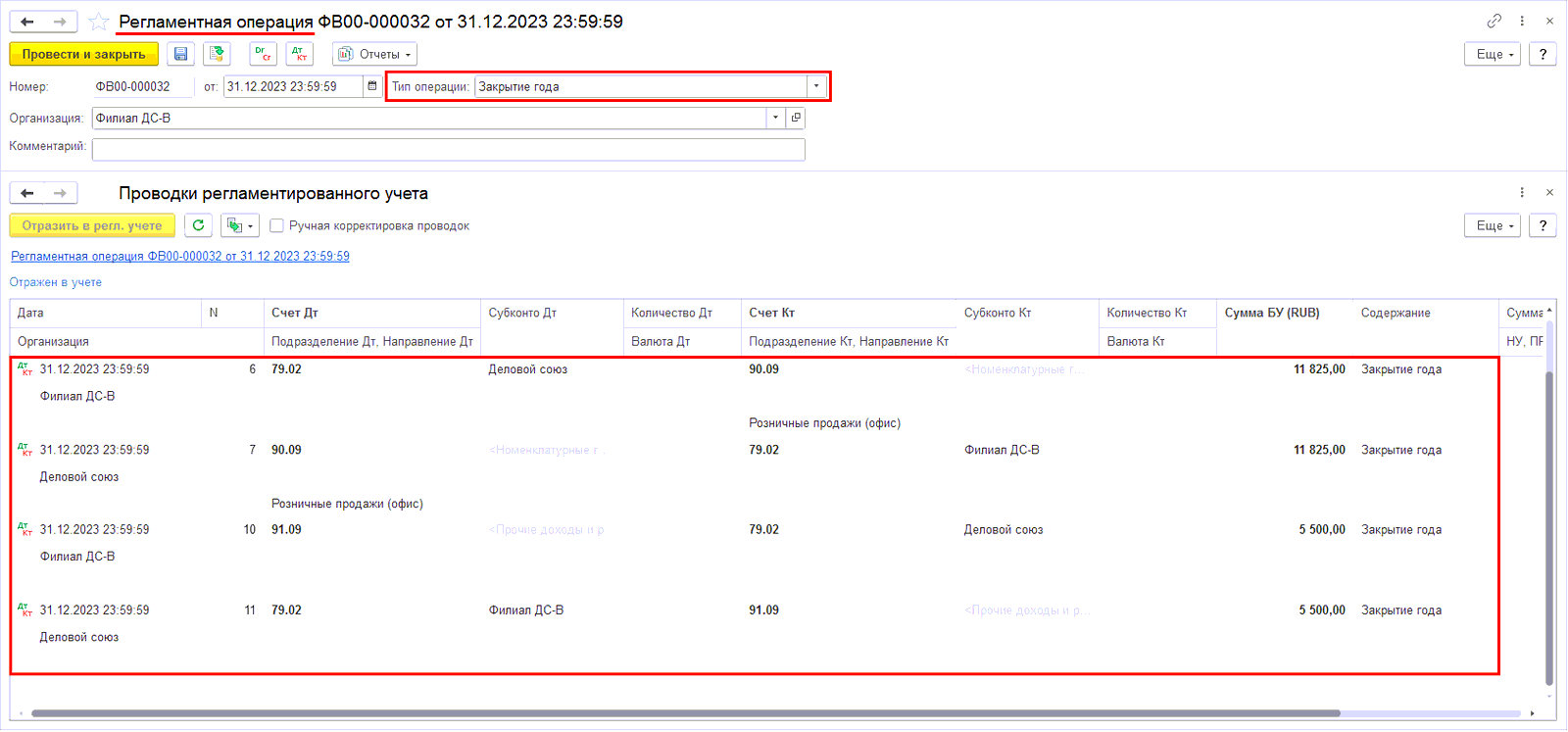 Если настройка При реформации баланса закрывать 90 и 91 счета филиалов через 79 счет включена, тогда в рамках регламентной операции Закрытие года по обособленному подразделению автоматически формируются проводки на сумму полученного в нем финансового результата вида Дт 90.09 «Прибыль / убыток от продаж» и 91.09 «Сальдо прочих доходов и расходов» Кт 79.02 «Расчеты по текущим операциям» и Дт 79.02 «Расчеты по текущим операциям» Кт 90.09 «Прибыль / убыток от продаж» и 91.09 «Сальдо прочих доходов и расходов». Итогом формирования указанных проводок является закрытие счетов 90 «Продажи» и 91 «Прочие доходы и расходы» в обособленном подразделении.