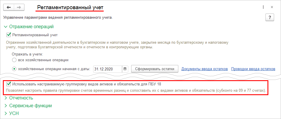 Настройка группировки видов активов и обязательств с использованием элементов справочника Правила группировки активов и обязательств для ПБУ 18 определяется включением новой функциональной опции Использовать настраиваемую группировку видов активов и обязательств для ПБУ 18 (меню НСИ и администрирование – Настройка НСИ и разделов - Регламентированный учет – Отражение операций).