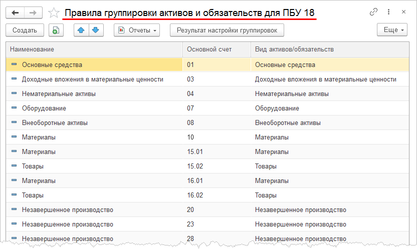 Элементы списка Правила группировки активов и обязательств для ПБУ 18 упорядочены с помощью скрытого поля РеквизитДопУпорядочивания. При заполнении списка после включения функциональной опции Использовать настраиваемую группировку видов активов и обязательств для ПБУ 18 сохраняется порядок правил из кода системы.