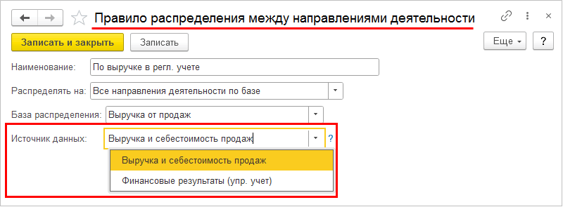 В карточку элемента списка Правила распределения и показатели (меню Финансовый результат и контроллинг – См. также – Правила распределения расходов закладка Расходов между направлениями деятельности) добавлено поле Источник данных, которое определяет по данным какого регистра накопления необходимо формировать базу распределения расходов на финансовый результат.