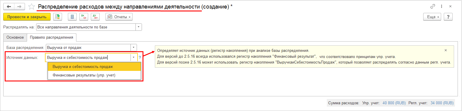 Выбор источника данных в документе Распределение расходов между направлениями деятельности определяет то, из какого регистра оперативного учета должна формироваться база распределения расходов для данного документа: Финансовые результаты (распределение расходов по данным управленческого учета) или Выручка и себестоимость продаж (для распределения расходов в управленческом учете из регистра берутся данные о выручке и/или себестоимости в управленческом учете, для распределения расходов в регламентированном учете из регистра берутся данные о выручке и/или себестоимости в регламентированном учете). Выбранный источник данных определяет источник формирования базы распределения расходов для всех видов учета, отмеченных в документе в списке Использовать.
