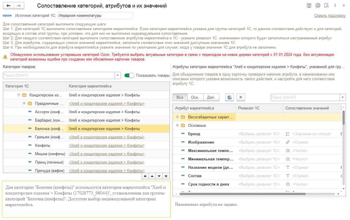 В связи с изменением дерева категорий торговой площадки требуется актуализация сопоставления категорий в 1С и торговой площадки Ozon, а также контроль ранее настроенных правил сопоставления атрибутов, т.к. состав атрибутов при изменении сопоставления (указания типа товара) также может измениться. Для упрощения контроля необходимости актуализации сопоставления категорий в форме настроек обмена с Ozon и в форме сопоставления категорий, атрибутов и их значений добавлено оповещение о наличии устаревших категорий.