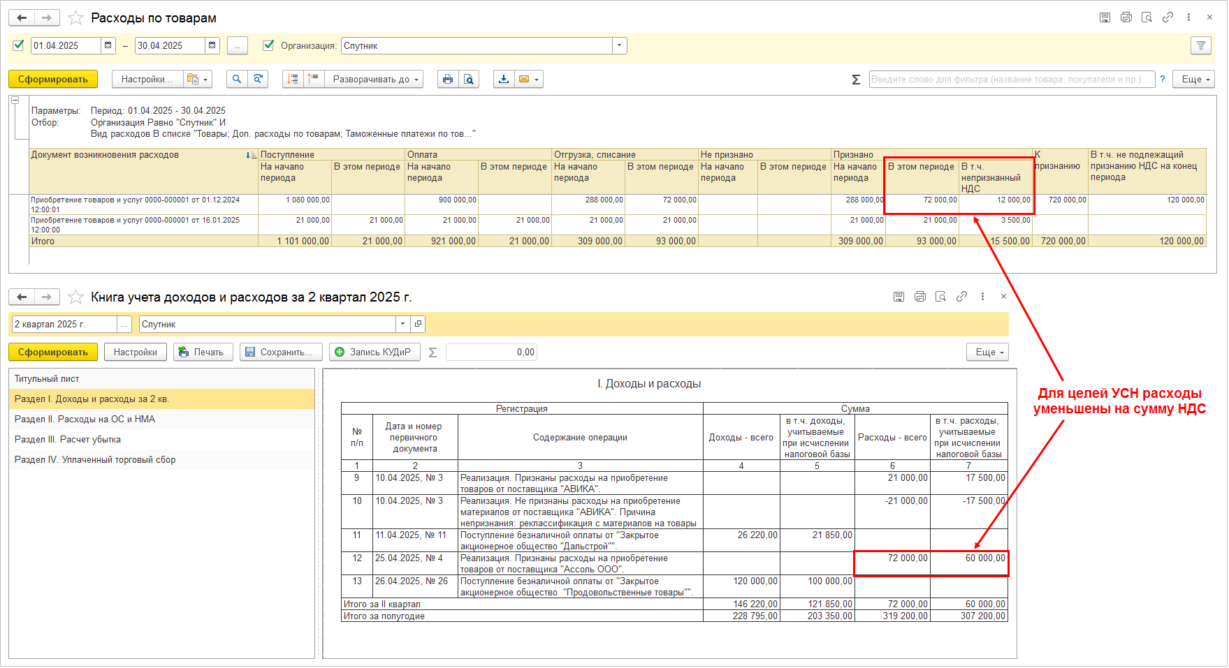 В т.ч. непризнанный НДС – НДС, который был исключен из расходов в момент признания из-за применения организацией общих ставок НДС. В книге учета доходов и расходов УСН отражается сумма расхода из колонки Признано за вычетом суммы из данной колонки;