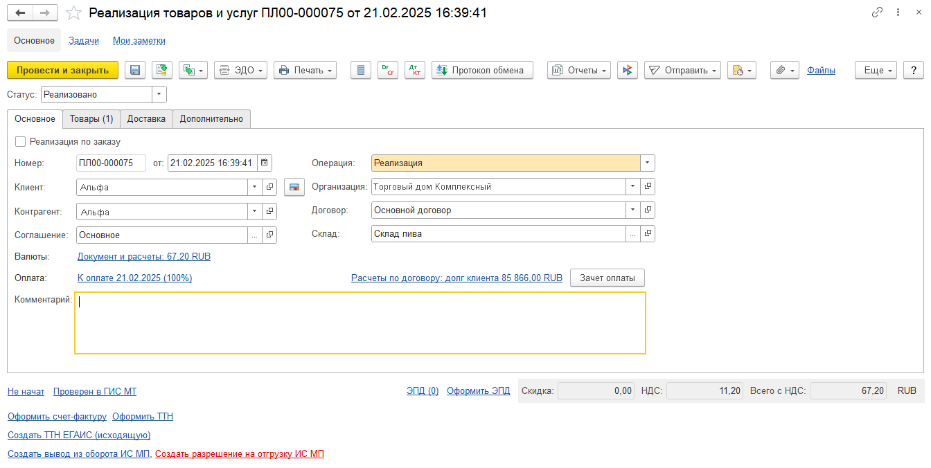 Документ Разрешение на отгрузку ИС МП создается в статусе Черновик и сохраняет в себе сформированный в информационной базе УПД. Передать УПД на проверку можно по ссылке передайте данные.