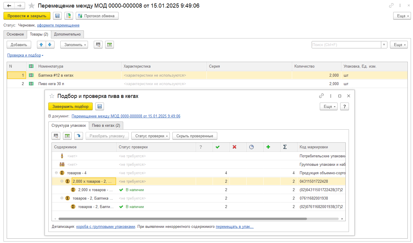В документе Перемещения между МОД возможно указание кодов маркировки возможно путем сканирования в форме документа, загрузки с ТСД или в форме Подбор и проверка… по аналогии с другими документами. Также возможно заполнение кодов по ОСУ в форме Подбор и проверка… и автозаполнение кодов по ОСУ при отправке документа.