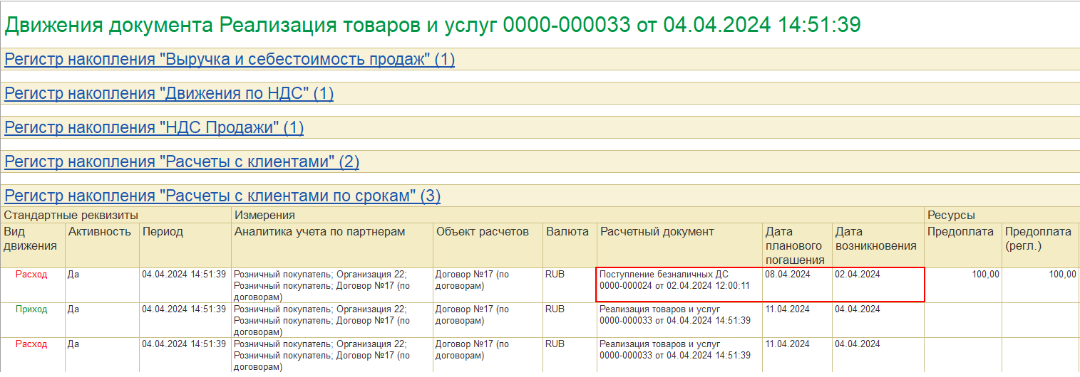 Оформляем еще Реализацию от 10.04.24 с датой платежа 13.04.24, проведенную позже аванса (оплаты от 09.04.24). При проведении Реализации от 10.04.24 перезачет оплаты не выполняется.