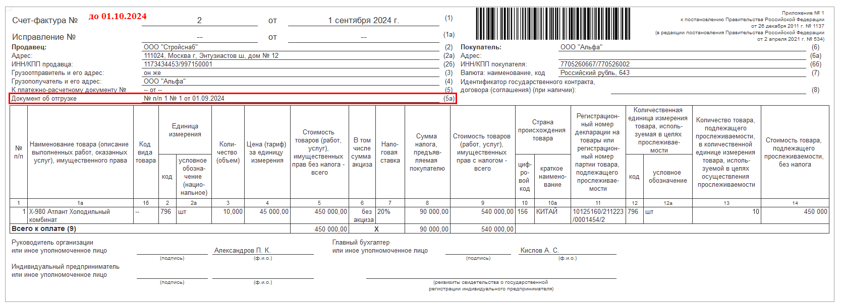 Печатная форма корректировочного счета-фактуры с прослеживаемыми товарами с 01.10.2024г.