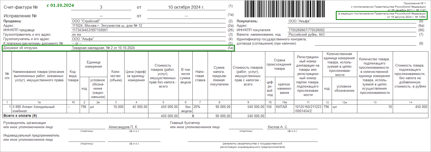 В шапке печатной формы счета-фактуры добавлено указание Постановления Правительства РФ от 16.08.2024 № 1096.