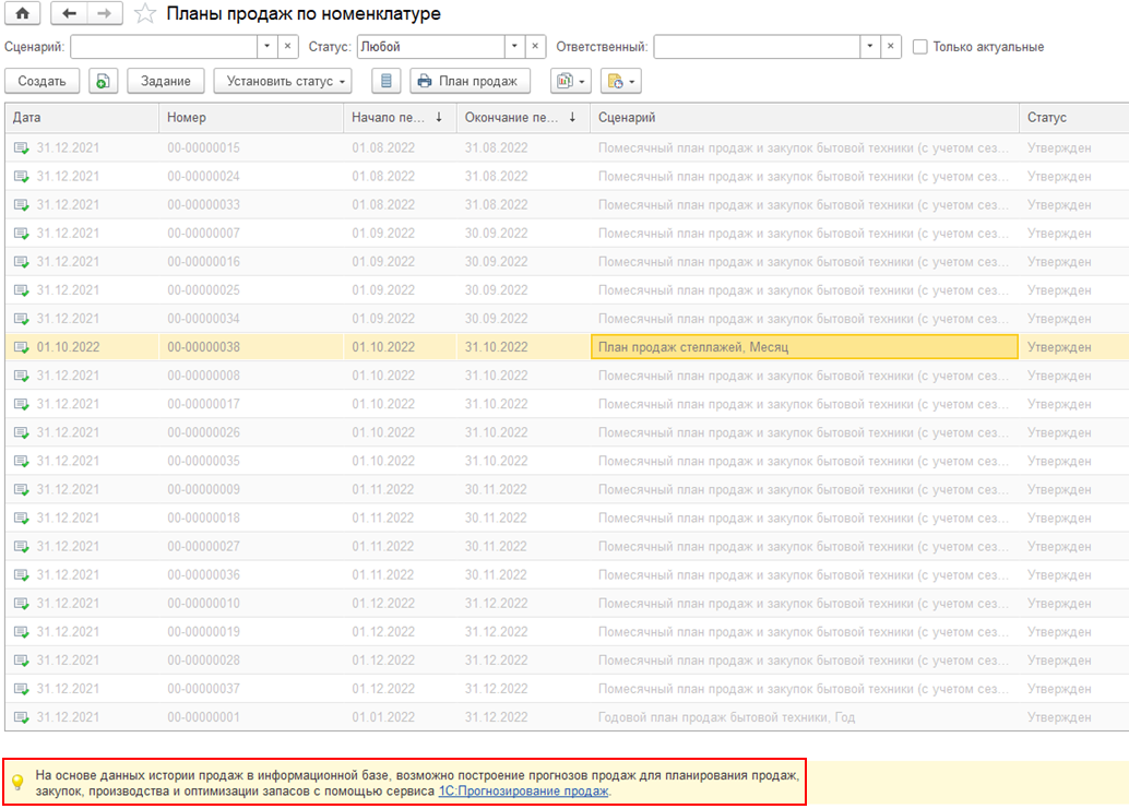 Если в информационной базе достаточно продаж и еще не используется сервис прогнозирования, то в списке документов Планы продаж по номенклатуре выводится рекламная информация. Гиперссылка 1С:Прогнозирование продаж ведет к помощнику подключения к сервису прогнозирования. При закрытии рекламного блока он больше не будет показываться у текущего пользователя.