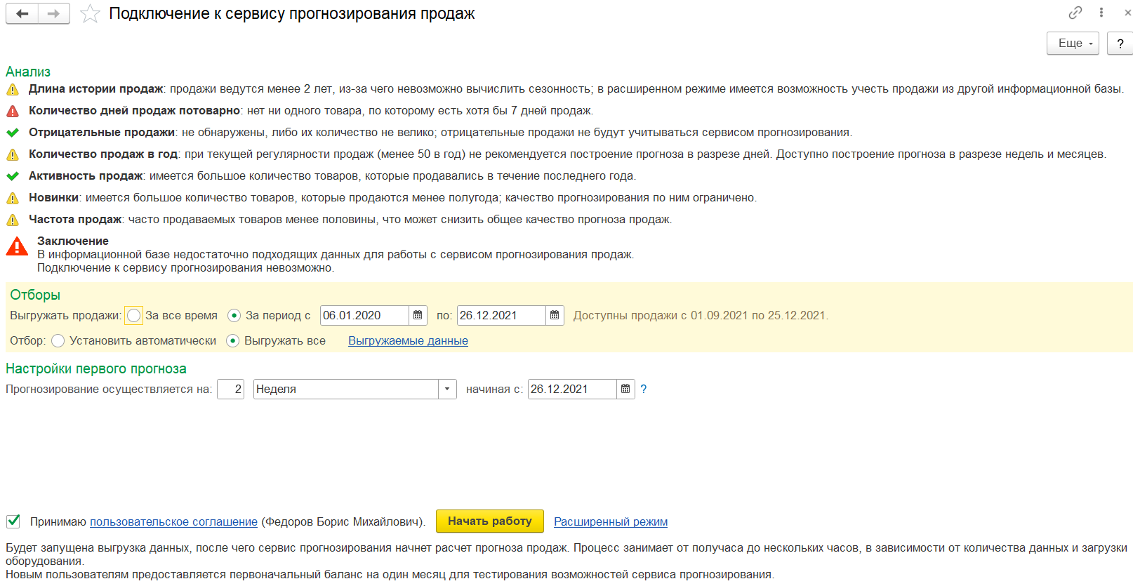 После принятия пользовательского соглашения и применения команды «Начать работу» будет рекомендовано перейти в рабочее место Сервис прогнозирования продаж по соответствующей гиперссылке.