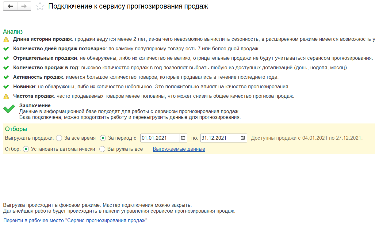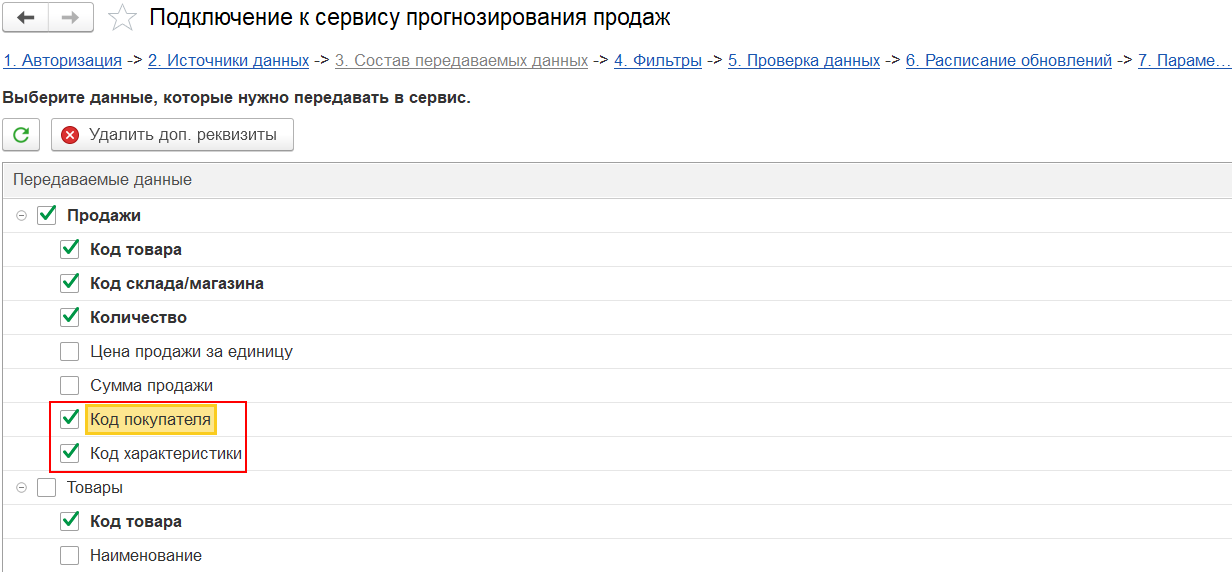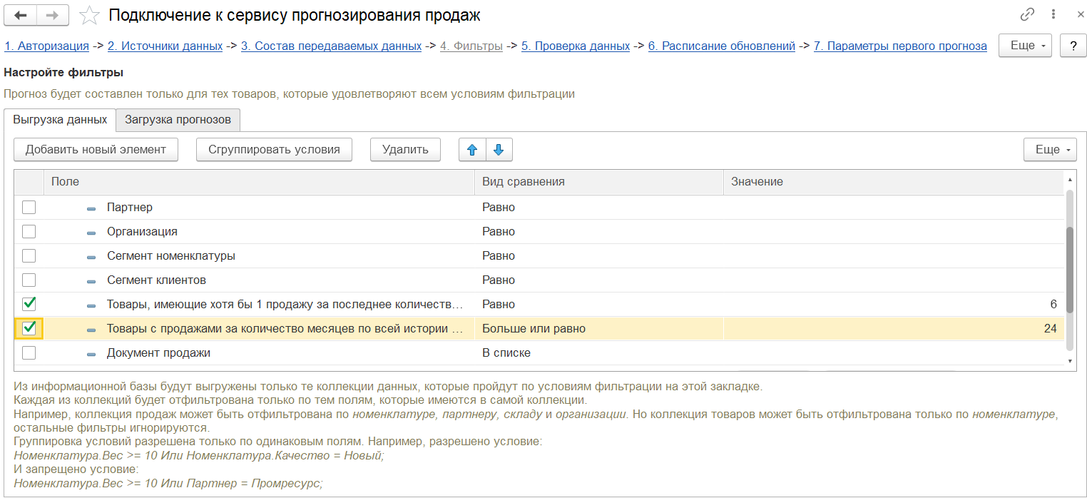 В помощнике подключения к сервису прогнозирования продаж в расширенном режиме на этапе 4  «Фильтры» добавлены новые отборы:
